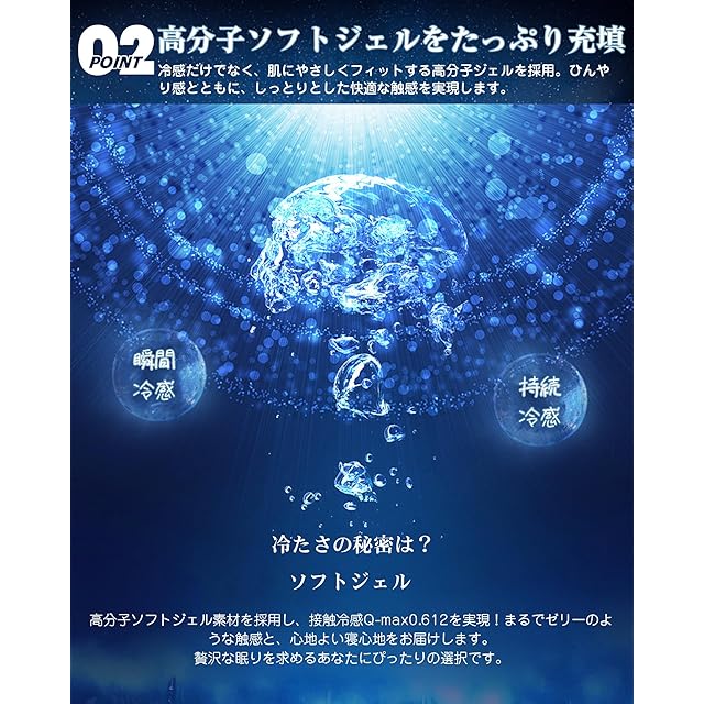 【Q-max0.612・持続冷感】水分をたっぷり含んだジェルがゆっくりと体の熱を吸収するため、身体を冷やしすぎることなく、ひんやり感が長く続きます。冷蔵庫に入れる手間もありません。エアコンの温度を下げる必要もなく、節電しながら快適な睡眠をお楽しみいただけます。