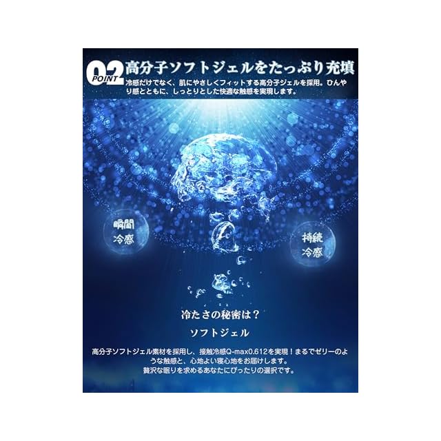 【Q-max0.612・持続冷感】水分をたっぷり含んだジェルがゆっくりと体の熱を吸収するため、身体を冷やしすぎることなく、ひんやり感が長く続きます。冷蔵庫に入れる手間もありません。エアコンの温度を下げる必要もなく、節電しながら快適な睡眠をお楽しみいただけます。
