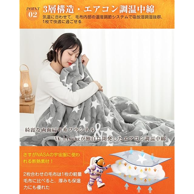 【オールシーズンで快適の秘密】NASAのために開発されたVK Living独自のエアコン調温中綿が入っており、人間が最も快適と感じる温度(28~33℃)を常にキープします。暑い時は、熱を吸収し温度を下げて、肌を冷やします。寒い時は、熱を放出し温度を上げて、肌を暖めます。春・秋は毛布一枚で快適。掛け布団と併用して、冬場もしっかり暖かい。