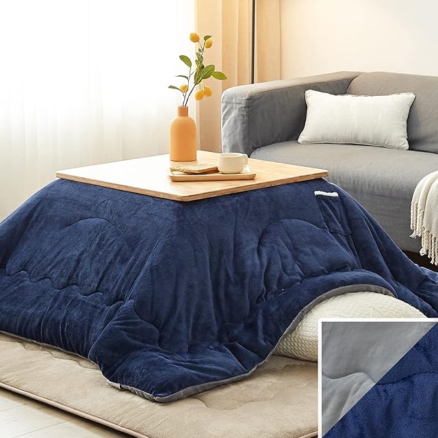 VK Living こたつ布団 正方形 単品185×185cm 中綿1.5kg 【SUPER HOT】 発熱綿使用+LockHeat速暖発熱繊維 撥水加工 ポケット付き フィットキルト こたつ掛け布団 リバーシブル 両面使える フランネル 保温性 丸洗いOK 静電気防止 毛抜けない グレー/ネイビー