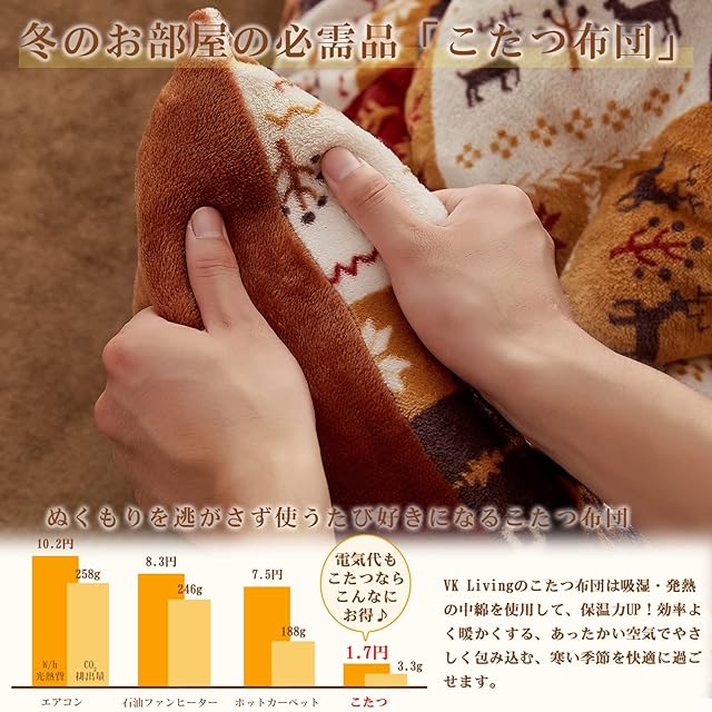 VK Living こたつ布団 長方形 単品185×235cm 中綿1.8kg 【SUPER HOT】 発熱綿使用+LockHeat速暖発熱繊維 撥水加工 ポケット付き フィットキルト こたつ掛け布団 リバーシブル 両面使える フランネル 保温性 丸洗いOK 静電気防止 毛抜けない 鹿柄・ブラウン