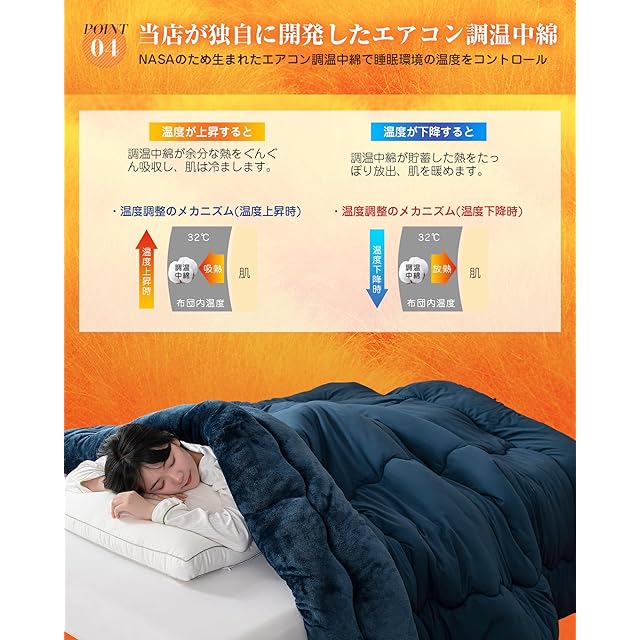 【電気を使わない暖かさの極みへ】NASAのために開発されたVK Living独自の【宇宙服の調温中綿】が入っており、人間が一番快適だと感じる温度(28~33℃)をずっとキープしようと働きかけます。暑い時は、熱を吸収し温度を下げて、肌を冷まします。寒い時は、熱を放出し温度を上げて、肌を暖めます。春・秋は毛布一枚で快適。掛け布団と併用して、冬場もしっかり暖かい。
