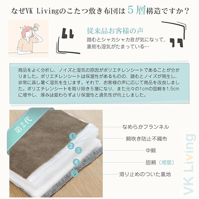 【5層構造】こたつ敷き布団は固綿入りの5層構造です。中心にある固綿が底付き感を軽減します。さらにふんわり中綿とポリエチレンシートがこたつ本体の熱をため込み、床面からの冷気を防ぐからぽかぽかです。