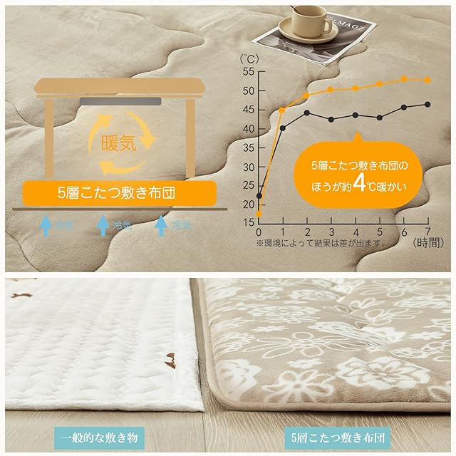 【5層構造】こたつ敷き布団は固綿入りの5層構造です。中心にある固綿が底付き感を軽減します。さらにふんわり中綿とポリエチレンシートがこたつ本体の熱をため込み、床面からの冷気を防ぐからぽかぽかです。