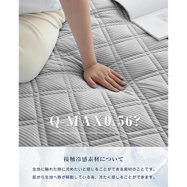 【Q-MAX-0.56極冷感敷きパッド!】サラサラツルツルっとした肌触りで、身体にまとわりつきを感じない接触冷感素材、寝返りのたびに心地良いひんやり感が伝わり、寝苦しい夜にもひんやりとした感触をお楽しみいただけます。