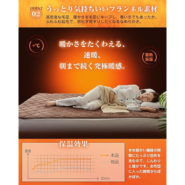 【高密度フランネル】超極細のフランネル繊維を使用、細かい繊維の間に空気を取り込むので暖かい空気を逃がしません。高密度で繊維がしっかりしているので、毛抜けも少ない。布団に入るときのヒヤっと冷たい感覚が苦手という方にはおすすめです!
