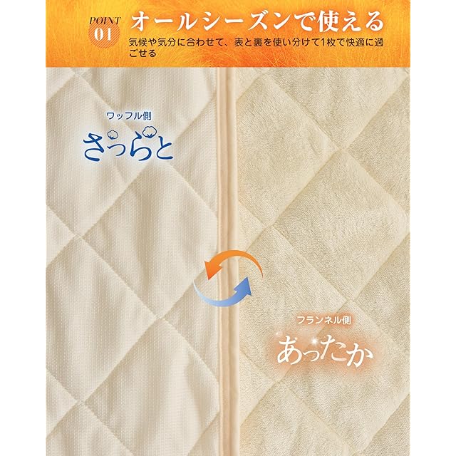 【リバーシブル】肌に触れる部分が表裏で違います。肌寒い時にはやわらかくて温かいフランネル側で、暑さや湿気を感した時にはワッフル側で。気候や気分に合わせて、表と裏を使い分けて1枚で快適に過ごせる!