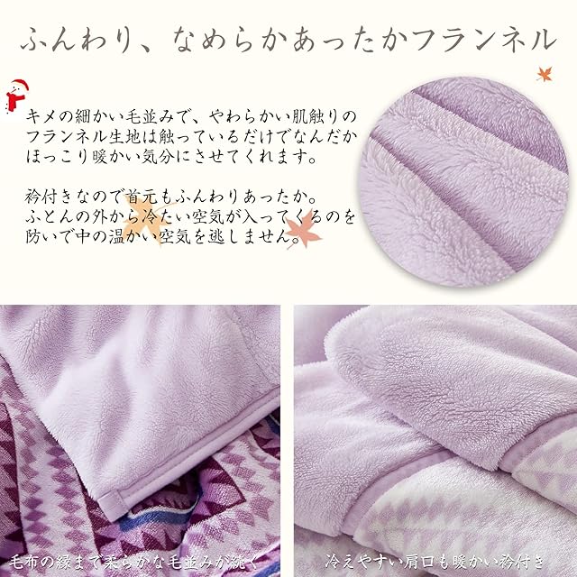 【フランネル生地】キメの細かい毛並みで、やわらかい肌触りのフランネル生地は触っているだけでなんだかほっこり暖かい気分にさせてくれます。衿付きなので首元もふんわりあったか。ふとんの外から冷たい空気が入ってくるのを防いで中の温かい空気を逃しません。