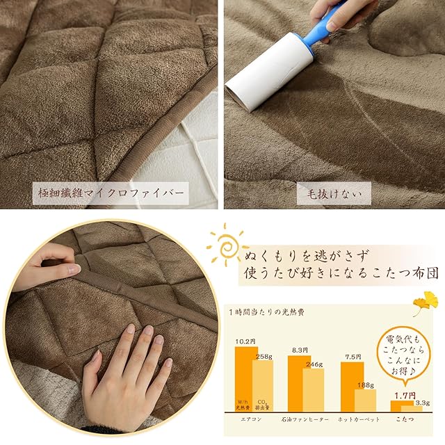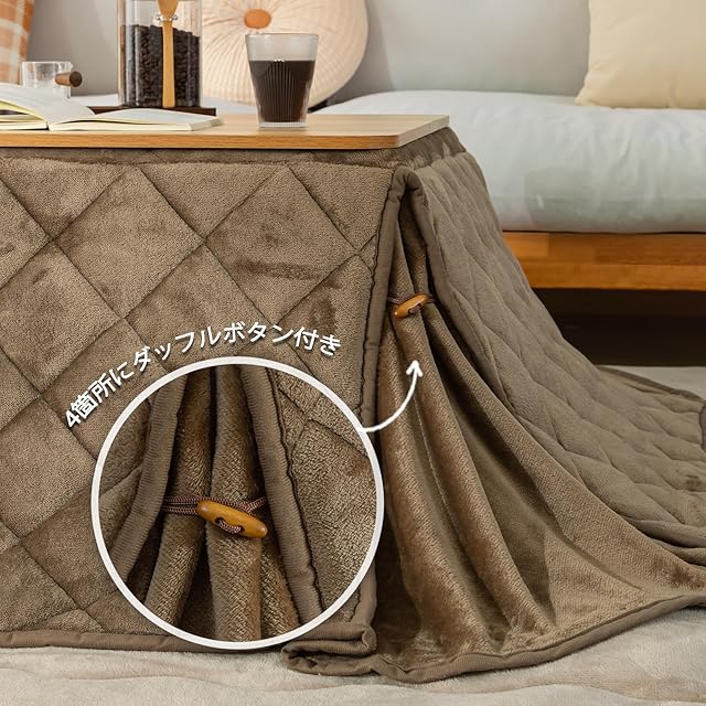【省スペースデザイン】標準型のこたつ布団に比べ、見た目スッキリです。場所をとらなくてお部屋を広くスマートに使えます。よりコンパクトに使えるダッフルボタンも付いています。