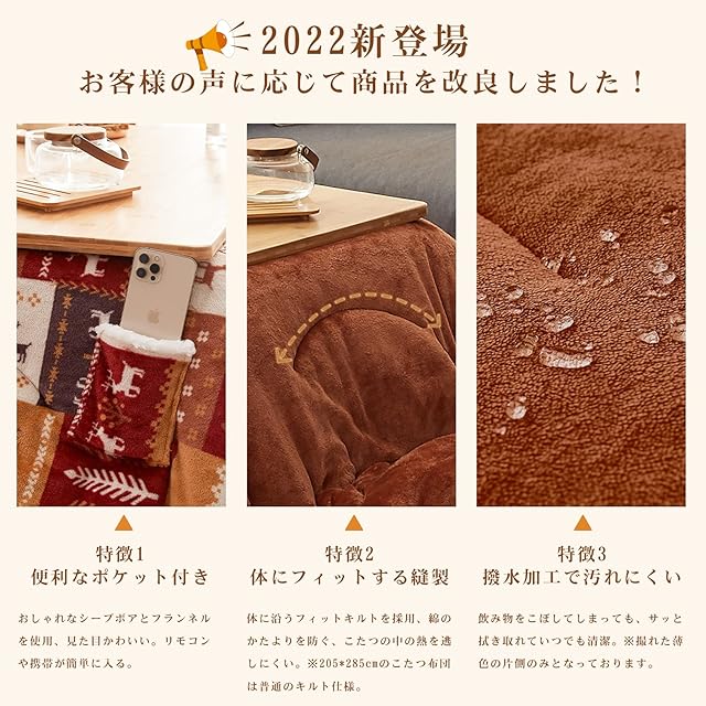 【便利なポケット付き】おしゃれなシープボアとフランネルを使用、見た目かわいい。リモコンや携帯が簡単に入る。【体にフィットする縫製】体に沿うフィットキルトを採用、綿のかたよりを防ぐ、こたつの中の熱を逃しにくい。※205*285cm/205*315cmのこたつ布団は普通のキルト仕様。【撥水効果で汚れにくい】飲み物をこぼしてしまっても、サッと拭き取れていつでも清潔。