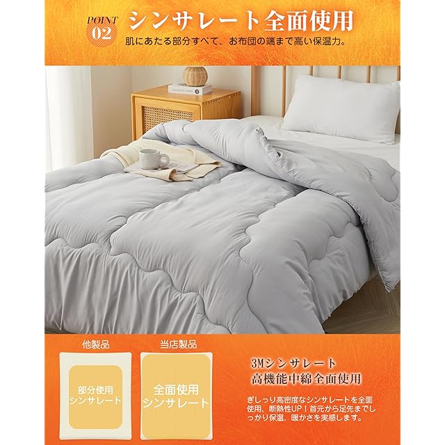 【シンサレート羽毛より暖かい】薄くて軽いのに暖かい!断熱素材シンサレートを全面使用で保温カアップ!同じ厚みの一般的な布団と比べて、2倍の保温機能を持っています。薄くても暖かい断熱素材で身体の熱を外に逃さず、しかも湿気を通すので快適です。