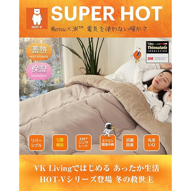 【1秒速暖・LockHeat速暖発熱繊維】LockHeatはVK Living独自開発し、すばやくあたたまる、1秒で速暖の発熱保温繊維。発熱効率が普通のポリエステルより198%上がり、特別な螺旋状で、しっかり熱をキャッチし逃がさない。暖かさに包まれて暖眠でき、朝まで暖かくぐっすりできます。