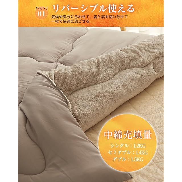 【リバーシブル・両面使える掛け布団】表地にはあったかフランネル生地で、保温機能をプラスしてさらに暖かい。裏地には触りなめらかピーチスキン生地で、雲の中に被せたような柔らかさがあります。2種類の素材が楽しめるかけ布団、どちらもやわらかな触感で肌触りも抜群です。掛けカバーなしでそのまま使えます。静電気防止加工で乾燥な季節でもご心配なく使用できます。