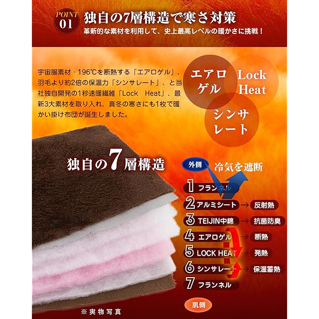 【独自の7層構造で寒さ対策】革新的な素材を利用して、史上最高レベルの暖かさに挑戦!宇宙服素材‐196℃を断熱する「エアロゲル」、羽毛より約2倍の保温力「シンサレート」、と当社独自開発の1秒速暖繊維「Lock Heat」、最新3大素材を取り入れ、真冬の寒さにも1枚で暖かい掛け布団が誕生しました。