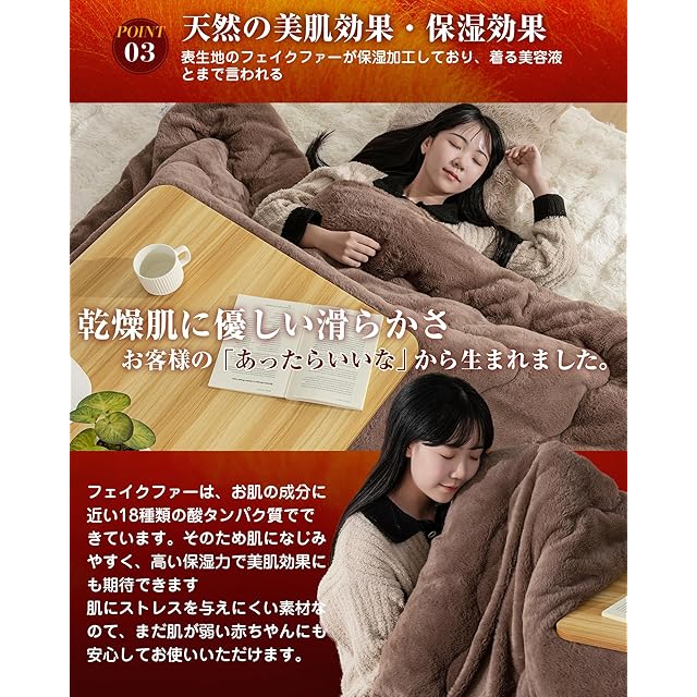 【天然の美肌効果・保湿効果・リラックス効果】VK Livingこたつ布団の表面のファーには、保湿性が非常に高いアミノ酸が30%も含まれています。これによって、長時間の保湿効果があり、お肌に張りと潤いを与え、肌の水分を適切に調整し潤いを保つ効果もあり、敏感肌や乾燥肌などのデリケートな肌にも、優れた素材といえます。