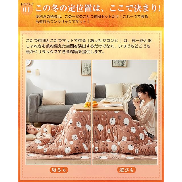 【掛敷セットのこたつ布団】掛け布団と敷き布団がセットになったこたつ布団で、敷き布団のサイズや柄を気にする必要はありません。掛け布団に最適なサイズで、同じ柄の敷き布団を使うことができ、簡単に統一感を演出できます。