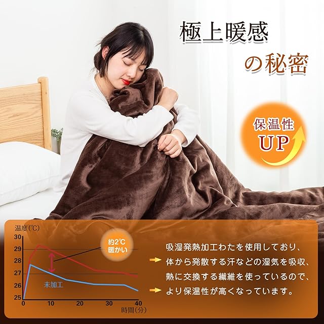 吸湿発熱繊維を使用しています。 体から発散する汗などの湿気を吸収、熱に変換する吸湿発熱繊維を使っています。 この吸湿発熱は「凝縮熱」と呼ばれるもので、水蒸気が水に変化する時に起こる熱エネルギーで繊維が湿度をコントロールし、汗で身体が冷えるのを防ぎ、快適な睡眠を得られます。