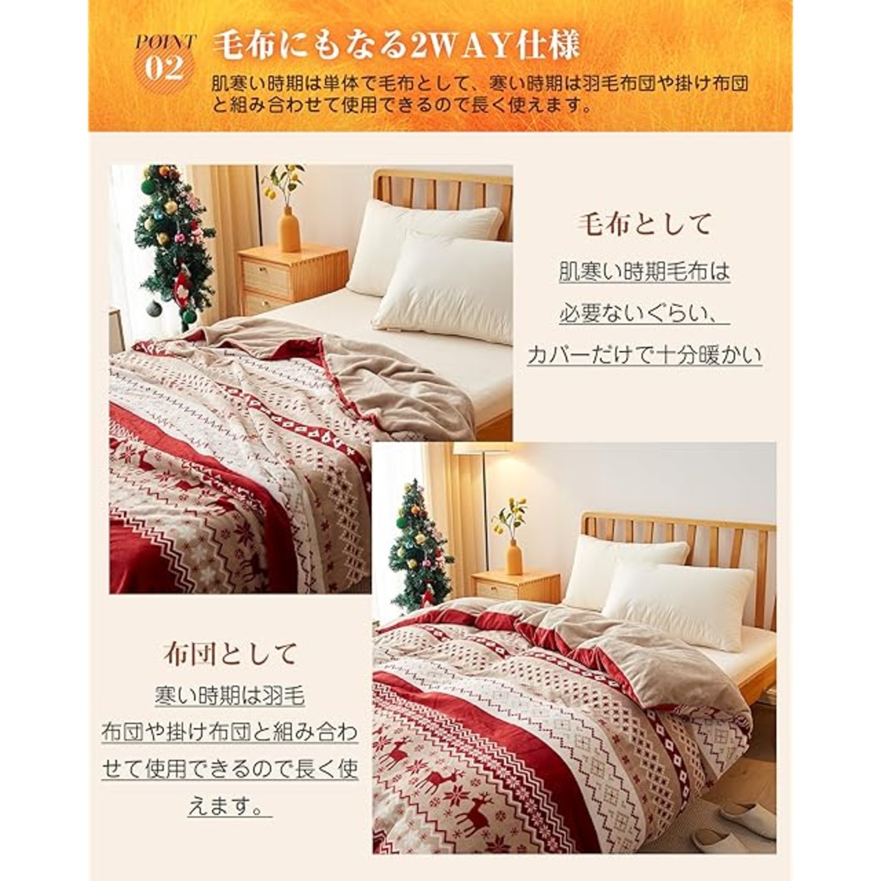 【毛布にもなる2WAY仕様】肌寒い時期は単体で毛布として、寒い時期は羽毛布団や掛け布団と組み合わせて使用できるので長く使えます。季節の変わり目や微妙な温度調節に最適。