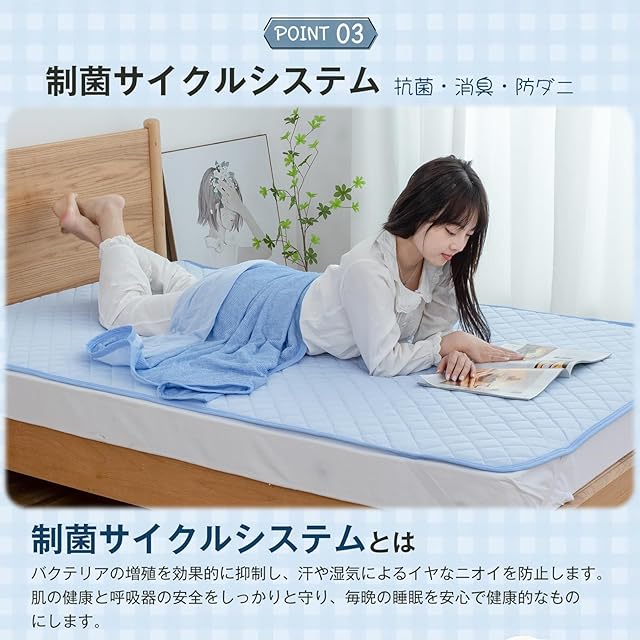 【制菌サイクルシステム:抗菌・消臭・防ダニ】バクテリアの増殖を効果的に抑制し、汗や湿気によるイヤなニオイを防止します。また、ダニの繁殖を防ぎ、肌の健康と呼吸器の安全をしっかりと守り、毎晩の睡眠を安心で健康的なものにします。