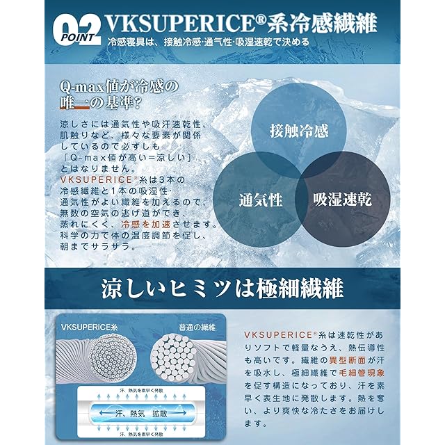【VKSUPERICE 糸冷感繊維】寝床内気候が温度33±1℃、相対湿度50±5%の範囲であれば、快適な睡眠が得られている。VKSUPERICE 糸は3本の冷感繊維と1本の吸湿性・通気性がよい繊維を加えるので、通気性に優れていて、無数の空気の逃げ道ができ、冷感を加速させます。科学の力で体の温度調節を促し、快適な寝床内気候を維持し、朝までサラサラ。