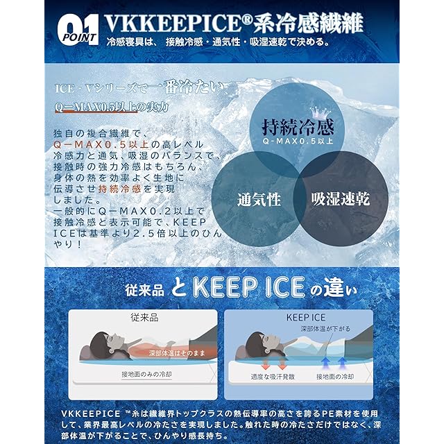 【VKKEEPICE 糸冷感繊維】寝具業界最高峰のひんやり感Q-MAX0.56を実現!VKKEEPICE 糸は繊維界トップクラスの熱伝導率の高さを誇るPE素材を使用して、業界最高レベルの冷たさを実現しました。触れた時の冷たさだけではなく、深部体温が下がることで、ずっと『ちょうどいい』冷たさをキープ、朝までひんやり持続。暑がりさんも朝までぐっすり。