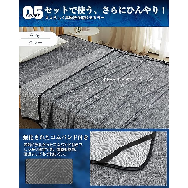 【リバーシブル】表面は業界最高レベルの冷たさQ-MAX0.5以上の接触冷感生地で、触れた瞬間ヒンヤリ!裏面はやさしい肌さわりタオル地。気候や気分に合わせて、表と裏を使い分けて1枚で快適に過ごせる!ポリエチレンの白糸と、カラーに染めたナイロンの2色の糸を混ぜ織りにすることで、涼しげな霜降りデザインに仕上げました。