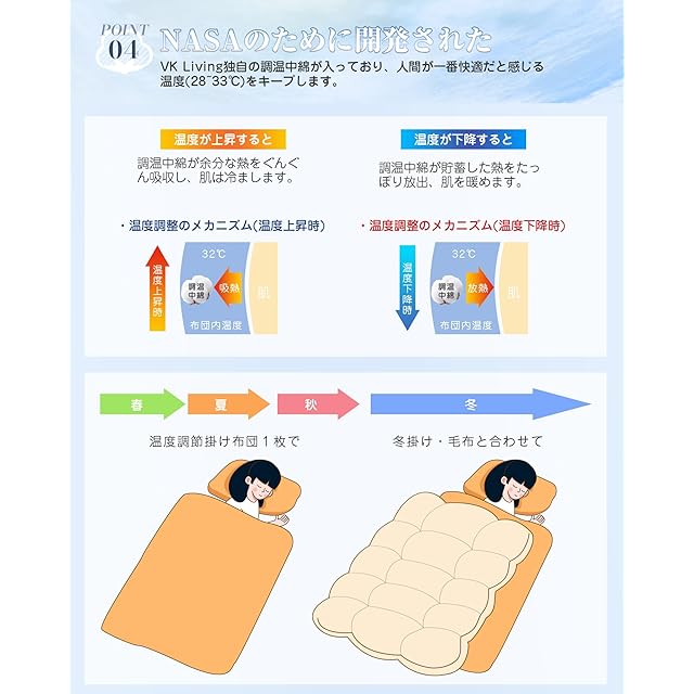【オールシーズンで快適の秘密】NASAのために開発されたVK Living独自の調温中綿が入っており、人間が一番快適だと感じる温度(28~33℃)をずっとキープしようと働きかけます。暑い時は、熱を吸収し温度を下げて、肌を冷まします。寒い時は、熱を放出し温度を上げて、肌を暖めます。春・夏・秋は掛け布団一枚で快適。毛布と併用して、冬場もしっかり暖かい。