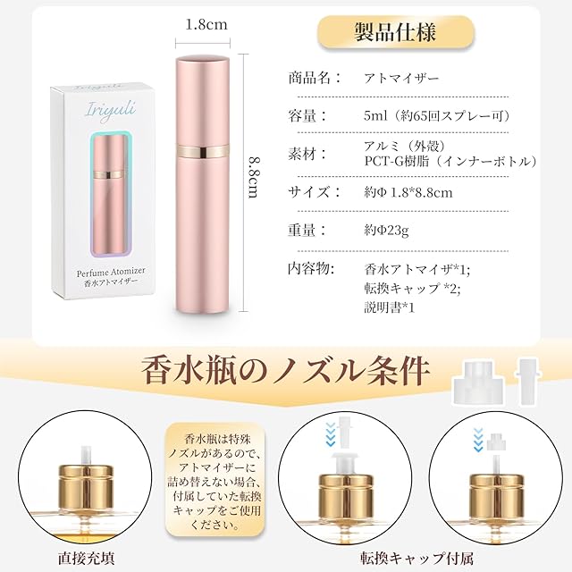 IRIYULI アトマイザー 香水 5ml 漏れない 2重構造 底部充填 簡単入れ替え 小分け容器 持ち運びに便利 詰め替えボトル おしゃれ 男女兼用 噴霧器 (ピーチゴールド)