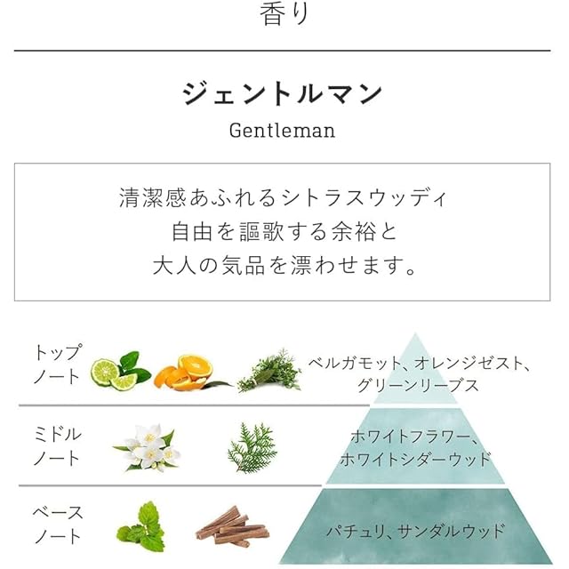 洗いあがりを彩る、清潔感あふれるシトラスウッディの香り バスルームに広がる爽やかな香りが、洗練された紳士にふさわしい上質なリラックスタイムを演出します。