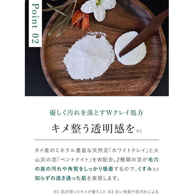 ✨【毛穴汚れ・くすみを落として、なめらかな素肌へ】 毛穴に詰まった皮脂や黒ずみ、古い角質によるくすみなど、肌悩みの原因を吸着して落とす天然泥のホワイトクレイ・ベントナイトを配合。不要な汚れだけを落として、透明感のある素肌へ導きます。