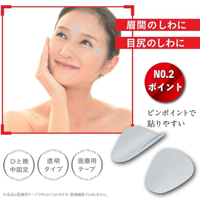 【シワ伸ばしテープ】 ポイントで貼りやすい![一点集中カバー] お休み中のしわ伸ばしテープ No2.ポイントタイプ(増量パック)。 日々のクセで肌は変化する。表情じわを予防! この「おやすみ中のしわ伸ばしテープ」は、寝る前にしわが気になる部分に貼るだけ。 老けて見える1番の原因とも言われている顔の「シワ」<br> 年を重ねると、肌の弾力が少なくなり、普段の表情の「しわクセ」が少しずつ肌に刻まれていきます・・・。<br> 「おやすみ中の肌トレ しわ伸ばしテープ」は、毎日続けられる簡単ケア。<br> 寝る前にしわが気になる部分に貼るだけ。<br> 肌にハリを出してくれるほどよく堅い医療用テープが、寝ている間に表情筋を固定。<br> <br> おやすみ中にシッカリと、気になる表情じわを予防&リセットしましょう。<br> <br>