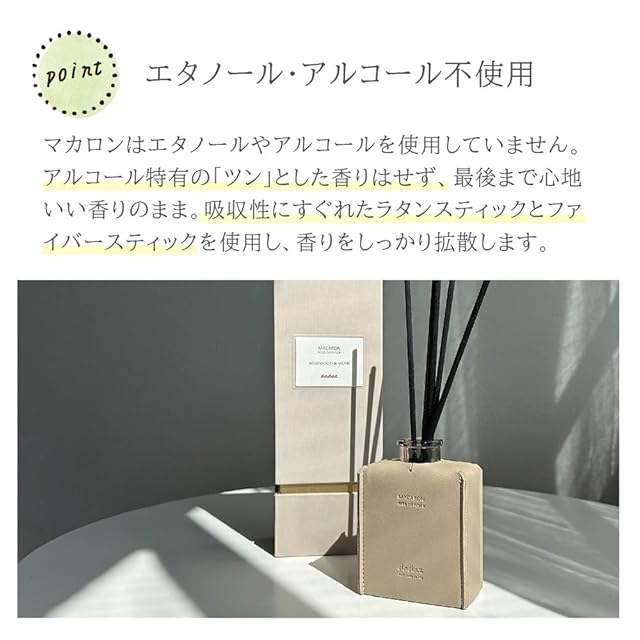 【dadaz Reed Diffuser MACARON (リードディフューザー マカロン)】 フェイクレザーのボトルカバーが生活感を隠し、インテリアのひとつに。 360 度どの角度から見てもおしゃれさを持てるように底面以外はフルカバー仕様にこだわりま した。 さらにボトルカバーに合わせ、リードの色を変えたことでがおしゃれさがよりアップ◎ 年代・性別問わずにおしゃれ使いができるリードディフューザーでギフトにもぴったりです。