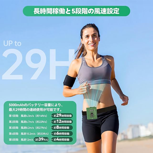 ウエストクリップファン - 充電式5000mAh 携帯型パーソナルファン、風速12m/s超強力風、最大29時間連続稼働、5段階風量調節、LED&SOSライト搭載(アウトドア・キャンプ・ハイキング・工事現場用)