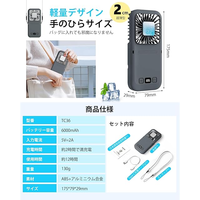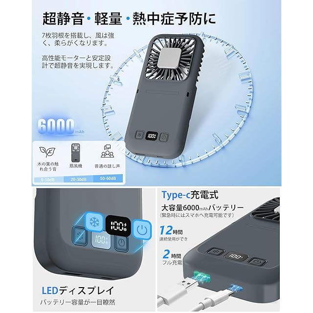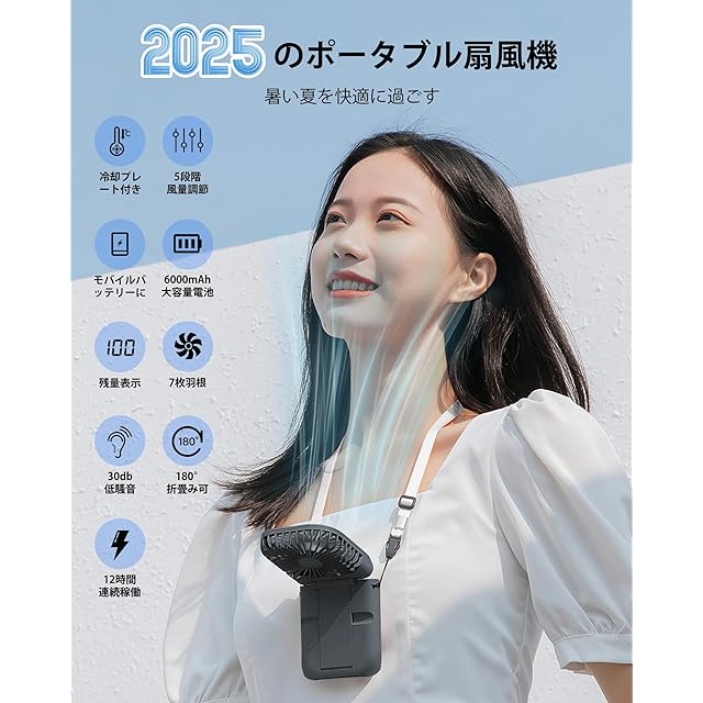 【よりコンパクトで持ち運びに便利&実用性抜群な「モバイルバッテリー」機能】約20mmの薄型ボディなら、小さなバッグやポケットにもすっぽり収まって携帯性抜群!コンパクトに2つ折りできるハンディファンなので、使用しない時は、引き出しや棚などの僅かなスペースに収納可能です。スマホより軽い約208g。長時間首にかけたり手で持って使用しても負担になりにくいです。さらに6000mAhのバッテリーとしてスマホの充電ができる!夏のレジャーは、キャンプや花火、海水浴など長時間のお出かけ時は電源の確保ができモバイルバッテリーとしても使えます。