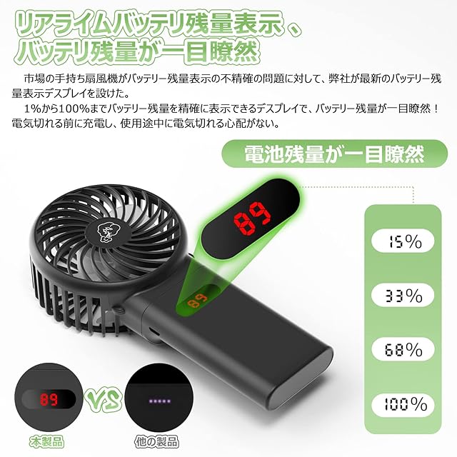 「ディスプレイデザイン&バッテリ―残量一目瞭然」弊社ではバッテリー残量を精確に表示できるディスプレイを設計し、市場での手持ち扇風機のバッテリー残量表示方式より一層精確で、1%から100%までバッテリ―残量を1%まで精確に表示られる。バッテリ―残量が一目瞭然で、適当に充電することができ、途中切れる心配がない。アウトドアに最適する。