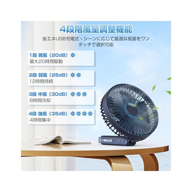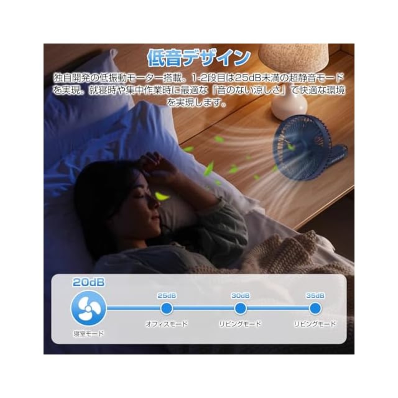 【25dB図書館級静音 × 4段階強冷丨睡眠/户外シーン両立丨深夜も屋外も一台で解決】 1-2段階モードでは25dB未満の静音設計を実現し、赤ちゃんの寝室やオフィスでの集中作業に最適な環境を提供します。 4段階の強風モードでは体感温度を5℃下げ、アウトドア活動時やキッチンなどの高温環境下での熱中症リスク軽減に対応できます。 さらに風量に連動した省エネ機能を搭載し、弱風時には自動で電力消費を70%削減するスマートモードを採用しています。