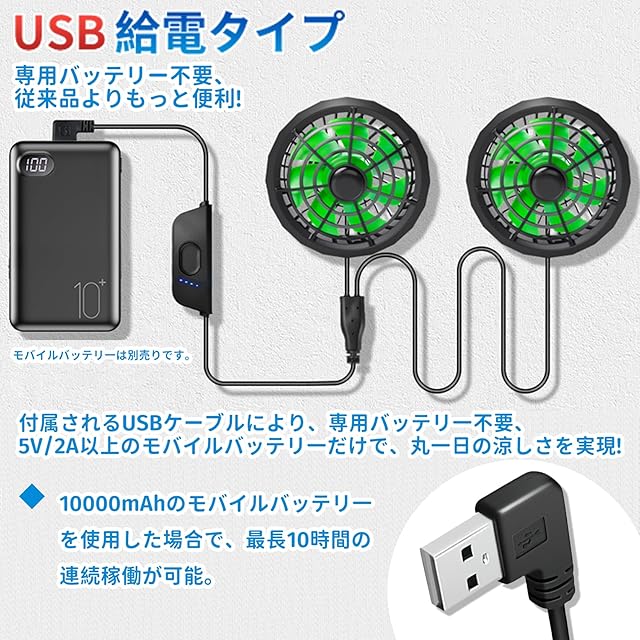 当社のファンは5V-7.4V高出力のUSB給電タイプを採用し、風速は従来の5V出力のUSBファンより40%を増やします。40℃の猛暑日でも服内が猛暑知らず楽にすごせます。フル充電後、最小風量で約10時間の連続使用可能です。1日中の作業でも十分対応可能、夏の屋外作業に欠かせない作業服ファンです。(※作業服・バッテリーは付属致しませんのでこ注意下さい)