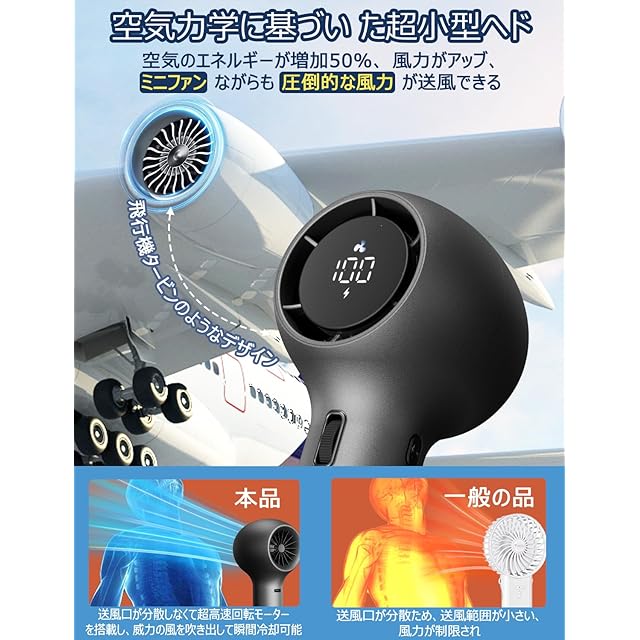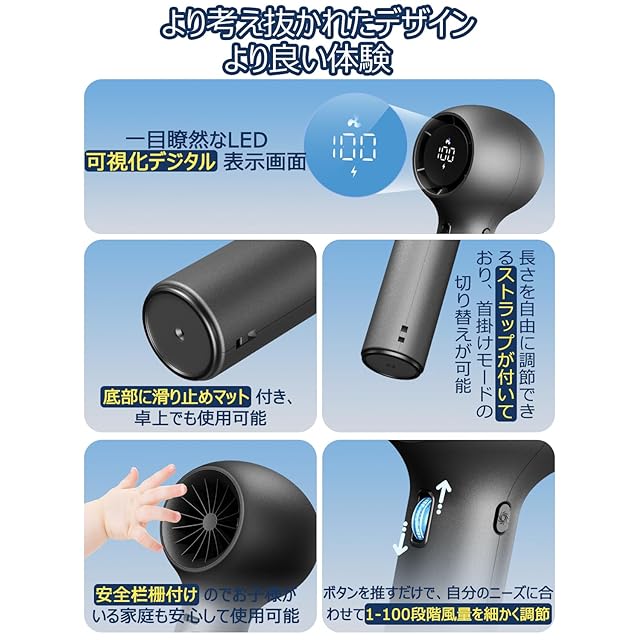 <b>【技術革新・1-100段階風量細かく調節可】</b> <br><br> 高速ヘアードライヤー類似のモーターを導入し、お好みに合わせて1-100段階の風量調節機能が搭載し、すべてのニーズを満たします。 シーンによってご自由で風量を簡単に調節できます。普通よりさらに細かく微調節できるタイプ、風に敏感な体質の人におすすめます。 <br>1~30段階は弱い風モードで優しく自然風を再現し、超静音で電車や職場や図書館でも快適に過ごせます。31~60段階は中風モードでパワフル送風し、暑い屋外で蒸し暑さを一掃冷たい,熱中症対応な猛暑必需品です。 61-100段階は強風モードで威力の風を吹き出し、最大回転速度15000RPMに達し、通常の個人用扇風機の3倍の風量を生み出します。 <br>ドライヤーの強風といった感じて、猛暑に瞬間冷感対策だけでなく、野外イベントにも最適です。キャンプ時に男性は短い髪を乾かしたり、火おこしをしたりすることができます。キャンプ愛好家に最適なギフトです。 <br><br> <b>【1台多役·軽量·携帯便利】</b> <br><br> 3Wayの使い方ができるハンディタイプの携帯扇風機です。 <br>①手にフィットするスリムなボディー設計で、握りやすく、手持ち扇風機として長時間使用しても疲れを感じません。 <br>②35cm長さを自由に調節できるストラップが付いており、ハンディーモードだけでなく、首掛けモードとしての切り替えが使用可能、落下を防ぎながら、すぐに使える状態で保持できるため、非常に実用的です。 <br>③底部に厚手の滑り止めマット付き、強風でも揺れません。卓上での使用もできるため、卓上扇風機としてオフィスや自宅でも便利にお使いいただけます。 <br>軽量かつコンパクトなサイズなので、いつでもどこでも手軽に持ち運ぶことができます。 本体の重さは145gと軽量なので、超コンパクトなボディでバッグにすっぽり収納でき、持ち運ぶにストレスはありません。 <br><br> <b>【LED可視化デジタル表示画面·120°広域吹出口】</b> <br><br> 高解像度のデジタルディスプレイを搭載し、リアルタイムの回転速度を表示します。風速とバッテリー残量を表示できて、いつでも必要に応じて調整するのに便利です。 いつでもバッテリー残量を確認でき、 使用状況を把握しやすく、事前に充電を手配できます。 <br>そして、精巧にデザインされた120°の吹出口と組み合わせ、送り出される風は速くて涼しく、また吹き出し範囲も広いです。 <br><br> <b>【超長航続・複数の充電方法】</b> <br><br> 3200mAh大容量バッテリー付き最大10時間連続使用、1段階で約10時間、100段階では約2時間使用できます。 (※ 充電しながらの使用もできます。) <br>アウトドア活動したりレジャータイムや仕事したりするとき、快適な涼しさを持続的に提供します。 <br>Type-C充電ケーブルも含まれており、通常のコンセント、モバイルバッテリー、ノートパソコン、または車用充電器で充電対応可能ので、外出先でも短時間での充電が可能です。 <br><br> <b>【今夏の救世主·様々なシーンに対応】</b> <br><br> 暑い日に手軽で便利な小型扇風機として、様々なシーンで、どこでも気軽に使えます。 <br>流行に敏感な方 & 運動や散歩などの屋外活動を頻繁にする方 & 顔に汗をよくかく方(化粧するとき、熱い食べ物を食べるときに便利! ) & 屋外で働く方に(建築現場、配達員、農家など) &外で遊ぶのが好きなお子様がいる方 & アウトドアやスポーツ観戦が好きな方(登山、サイクリング、バーベキュー、釣りなど) 場所問わず幅広いシチュエーションで涼風の爽快感を味わいながら、快適な時間を楽しむことができます。