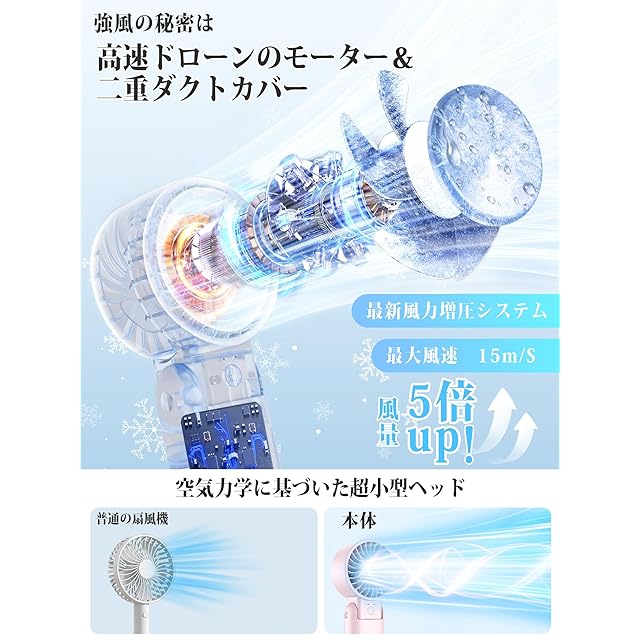 【パワフル送風・5段階調節可能・静かに】このせんぷうき扇風機は航空機のエンジンデザインによって設計されたファンヘッド、5枚のターボ羽根、二重ダクトカバーを搭載しており、螺旋状に力強く送風できます。通常の小型扇風機より風力が50%アップし、こもった熱気を一気に吹き飛ばします!ワンボタンで5段階に風量を調節できる特徴で自然に近い優しいそよ風から圧倒的な超強風まで、シチュエーションに合わせて微調整が可能で、老若男女問わず使得ます。冷却プレートと合わせて肌まで涼しさを届け、普通の扇風機より、汗のベタつきを抑えて、一層涼しさを感じられます。冷却プレート付きハンディファンはブラシレスdcモーターを採用して、従来型より騒音を80%減少されるし、耐久性も高くて、省エネ、静音といった優れた特徴を持っています。弱モードでは運転音は20デシベル程度と低く、図書館やオフィスにも、周りの人に迷惑をかける心配はなく、いつでもどこでも夏の涼しさを楽しみます。