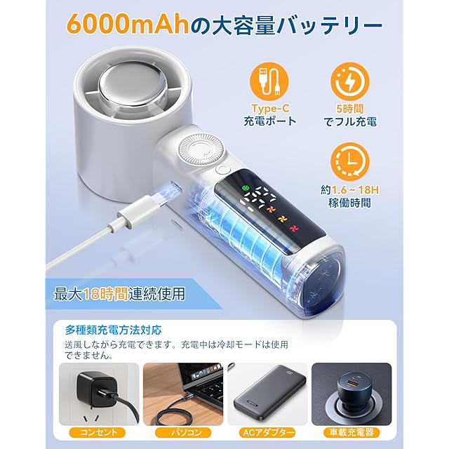 【6000mAh大容量 & 长時間連続 &液晶画面残量表示】この手持ち扇風機はUSB充電に対応しており、パソコン・充電アダプター・モバイルバッテリーなど多様な方法で充電が可能です。充電時は必ず外部の5V/2A電源に接続してください。フル充電には約5時間を要します。充電中は「ファンモード」のみ使用可能で、最大風量は60段階に制限されます。冷却モードは充電中に使用できません。内蔵の6000mAhリチウムイオンバッテリーは、風量設定や冷却モードの使用状況により最大15時間の連続稼働が可能です。液晶画面では以下の情報をリアルタイムで確認できます:残量パーセンテージ(「00」表示時は完全放電状態,速やかな充電が必要です。)、設定中の風量レベル(1~199段階)、現在の冷却モード(使用時はマークが点灯)。