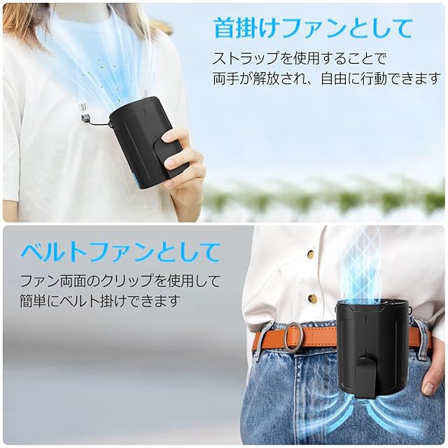 【多機能ファン】ファンの重量は140gで、一日中着用しても圧迫感を感じません。腰に掛けるだけでなく、首にかけることもできます。ファンの両端には2つのストラップホールが設計されており、付属のストラップを使って首に掛けることができます。仕事や移動中も、冷たい空気が首から顔周りに吹きます。両手が解放され、作業を妨げません。オフィスや家のデスク周りにも置いてデスクファンとして使用できます。
