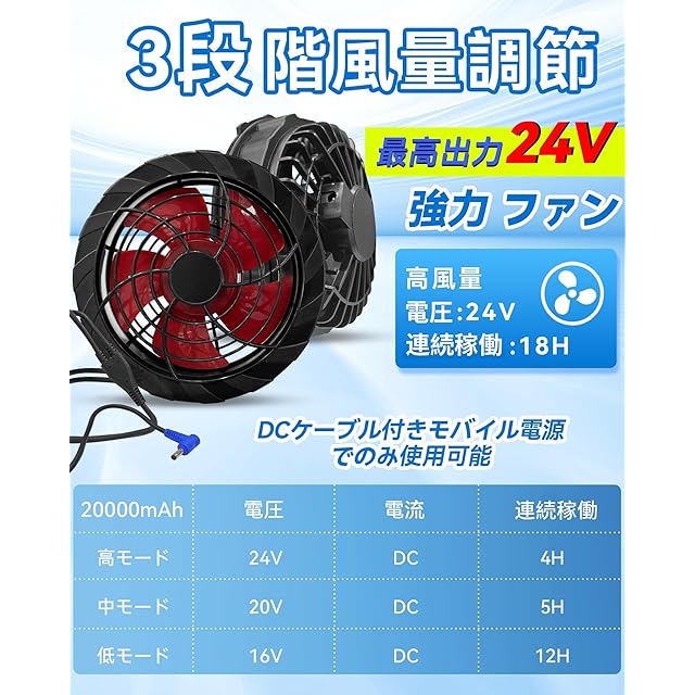【4段階風量調節・様々なシーンに対応】(24V 20000mAhバッテリー(別売)と組み合わせてご使用の場合、作業服ファンの風量は4段階に切替できます。電圧24V :約126リットル/秒、電圧20V :約115リットル/秒、電圧16V :約103リットル/秒、電圧12V : 約91リットル/秒、※風量はメーカー基準で測定した値です。ご使用時の目安としてください。工場内、工事現場、アウトドア、野外作業、農作業、運送、 建築業界、配達、出前、イベントスタッフ、室外環境の作業に適合し、様々なシーンで活躍します。