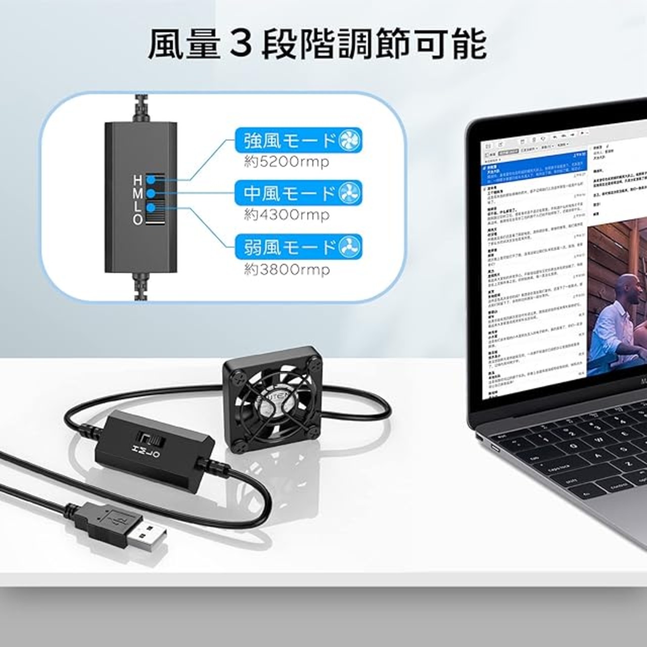 【軽量・コンパクト】卓上クーラーは面倒な配線が無く、USBインターフェースを採用して、プラグを差し込んで使用できます。風速調整スイッチを備えて、風量は3段階で調節可能。使用環境や用途に応じて、風量を選択できます。軽量・コンパクトで、場所を取りません。デスクのちょっとした隙間やパソコン本体の上などに置けます。4cm ファンなので持ち運びと収納も便利です。