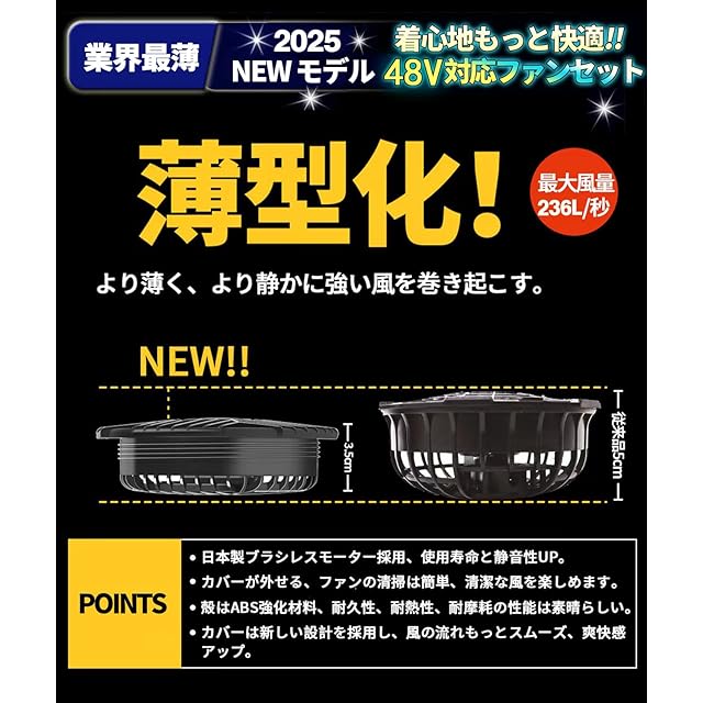 【無敵な暴風、周囲温度より-16.5℃の冷感を体験、高い互換性】新型48V対応のファンセットは日本製高精度ブラシレスモーターを採用し、内部にダブルボールベアリングの構造があり、旧型のモデルのファンセットと比較し、風量45%増大・騒音10%削減を実現しました。48V最大風量稼働時でも会話を邪魔しない静粛性を保持しながら、30,000時間の超長寿命を達成しました。ファンは5枚の広い羽根の設計、空気の流れを速め、風量を大きくすることができます。48Vのハイパワーバッテリーのエネルギーと相まって、最大風量236リットル/秒を巻き起こし、周囲温度より-16.5℃の冷感を楽しめます。爽快感アップ!!ファンの前面カバーが取り外し可能で、ファンの羽根のお手入れも便利で、綺麗で小さな乾燥の布巾で拭くだけで十分です。ファンの殻は航空用強化ABS材料を採用し、耐衝撃、耐高温、耐久性も素晴らしいです。ファンの内径は9cm、市販の99.99%のファン付き作業服と取り付けます。互換性が非常に高いです。ファン付き作業服と良く組合せです。