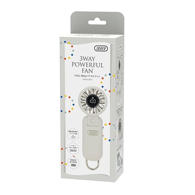 <b>100段階で風量を選べるパワフルなハンディファン!<br> 細かい調節ができて、いつでもお好みの風量に!<br> 最大風速は約6.0m/s !!<br><br> ヘッドが動くから、卓上でもハンズフリーでも大風量♪<br><br> ●風量は100段階から設定可能!<br> その日のコンディションに合わせて、お好みの風量でお使いいただけます。<br> 25段階スキップ機能も搭載しており、操作もラクラク︕<br><br> ●ハンディ/卓上/首掛けの3WAY!<br> ✔ハンディ<br> コンパクトで持ちやすいサイズ感。<br><br> ✔首掛け<br> 首掛けストラップが付属。<br> ヘッドが動くから、ハンズフリーでも使用可能◎<br><br> ✔卓上<br> ヘッドを動かして、卓上ファンとしてもご使用いただけます。<br><br> ●金属製のカラビナで持ち運びも安心♪<br> カラビナ付きなので、カバンやスマホショルダーに掛けて持ち運ぶことができます!<br><br> ◆Toffy Happy Collection◆<br> すっきり気分が晴れない日でも私たちの心を温かく照らし、<br> 暮らしに明るさと楽しさをもたらす存在でありたい。<br>そんな願いを込めたコレクションです。<br> お部屋や身の回りを心地よく活気づけ、日常に“Happy”と“Lucky”をお届けします。