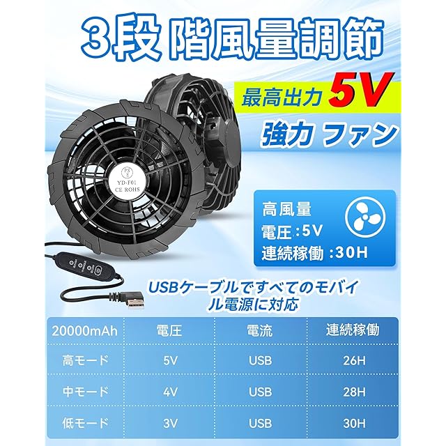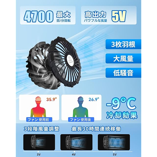 【強風.低騒音】ブラシレスモーターを装備しているこの高品質のファンは、同類製品に比べると、驚きほどのパワーで強力送風して涼しさを保つことができるだけでなく、低騒音。5V 強力 ファン付き 気流を胸方向や背中方向に集中させることも可能です。夏の幅広い現場作業において、疲労軽減、作業効率の向上、熱中症対策にも効果あります。