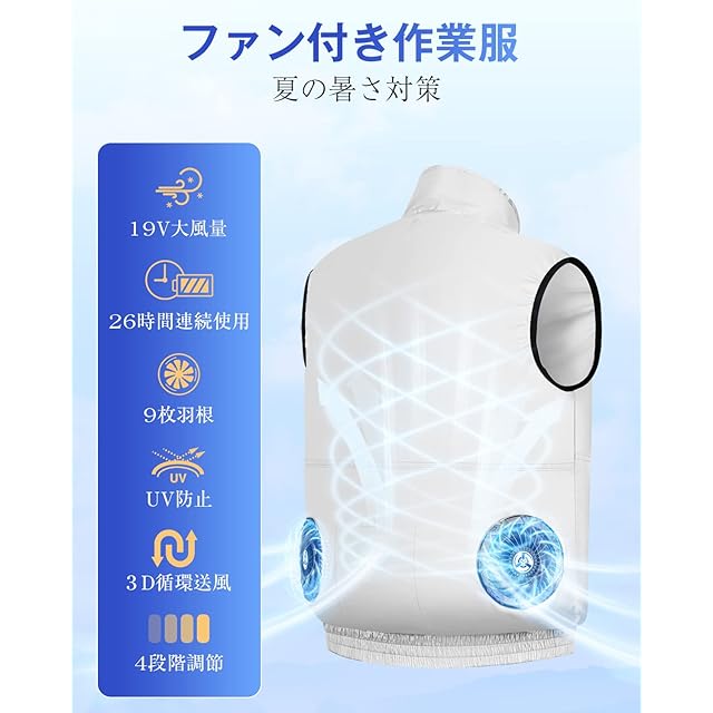 [Sumeriy] ファン付き作業服 ウェア ベスト 30000mAhバッテリ付き 19V超高出力 空調作業服 4段階風速調節 超長連続使用時間 大風量 USB給電式 UVカット 暑さ対策 熱中症予防 屋外作業 在宅 通勤 男女兼用 (XL, ホワイト)