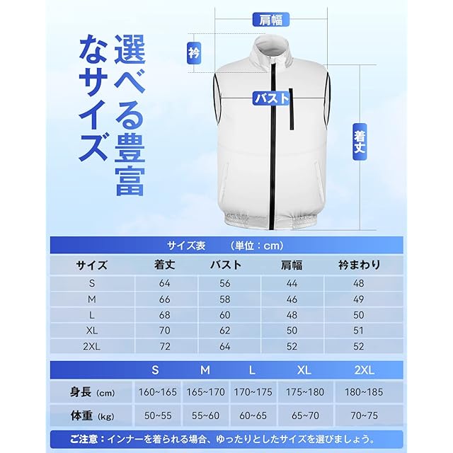 【6つのおすすめポイント】1、UVカット素材を採用し、紫外線からお肌をしっかり守ります。2、ゴム裾設計を取り入れ、密封性がアップした上、バッテリーの重量を分担させます。3、ファンの取り付け部に強化リングが付き、より簡単に取り付けられます。4、肩部分に調節ゴムが設計され、ベストの肩幅を調整可能。5、背後部にアイスポケットを完備。6、ケーブルホルダー付きで、作業中にケーブルの脱落を防ぎます。