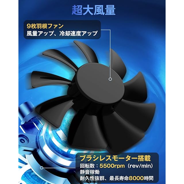 【9枚羽根-超大風量】ブラシレスモーターを搭載し、回転数が5500rpmに達し、静音稼働に長寿命を実現しました。9枚羽根ファンを採用したことにより、風量が一層アップし、瞬間的にクールダウンします。電気の変換効率を最大化し、エネルギー消費を節約します。