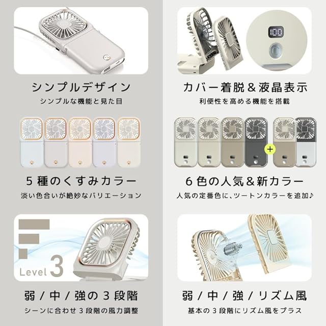 【***カバーの着脱が可能になりました***】こちらの商品はカバーの着脱が可能となり、これまでの製品で度々問題となっていた髪の毛や異物が絡まり、ホコリが溜まるという問題を解決!爽快な風をお届けします!こちらのハンディファンは付属の紐を使った首掛け扇風機機能だけでなく、デスクに設置して使えるスタンドタイプの扇風機としてもご利用いただけます。スタンドタイプの使用の場合にはスマホスタンドとしても利用が可能!涼みながらゆっくりと、動画の視聴などをお楽しみいただけます。風量レベル搭載で弱/中/強/リズム風(液晶タイプ、着脱式タイプ)お好みの風量をお選びください。3000mAhのバッテリーを搭載しており最大稼働時間約8時間(風量レベル弱)使用できます。充電品からの使用も可能です。形状的に安定感があるため、倒れにくく角度調整で的確に送風が可能です。通勤時に使用して、デスクワーク時には充電をしながら使用。帰りには再びポータブルファンとしてご利用ください。*ご使用の環境やバッテリーの状態により使用時間が異なる場合がございます。
